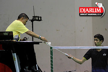 Umpire memberikan shuttlecock baru kepada A Rahmat Kurniawan (SGS PLN BANDUNG)