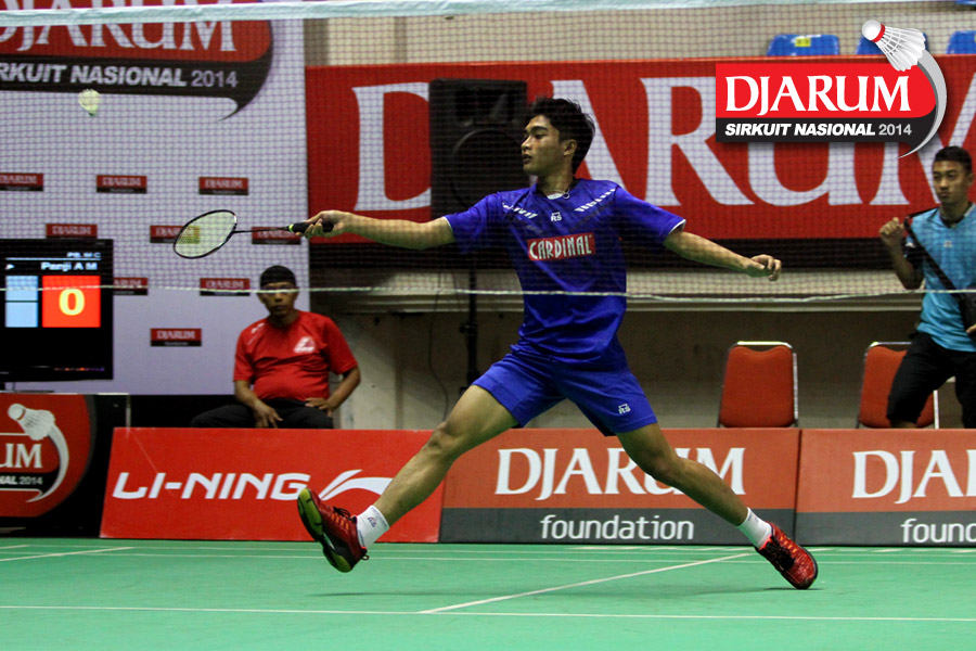 Panji Ahmad M (MUTIARA CARDINAL) mencoba menggapai shuttlecock