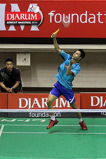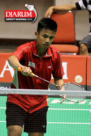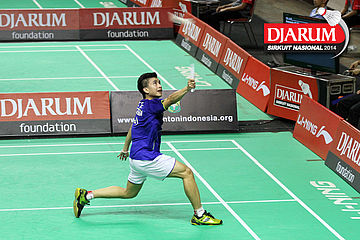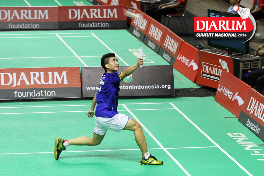 Endru Tampi (TANGKAS JAKARTA) mencoba menggapai shuttlecock