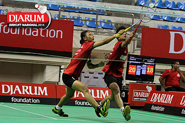 Adi Mas Sri Rama/Rachmaul Fu’adah (CITRA RAYA UNESA) mencoba menggapai shuttlecock