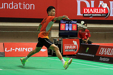 Bagas Kristianto Nugroho (DJARUM KUDUS) mengembalikan shuttlecock ke arahTri Haryanto (EXIST JAKARTA)
