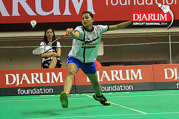 Devi Yunita Indah Sari (DJARUM KUDUS) mengembalikan shuttlecock ke arah Mia Mawarti Utami (GUNA DHARMA)