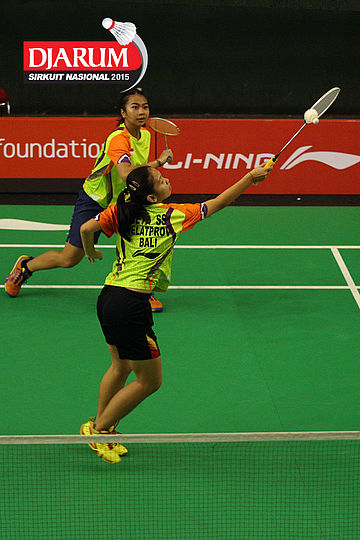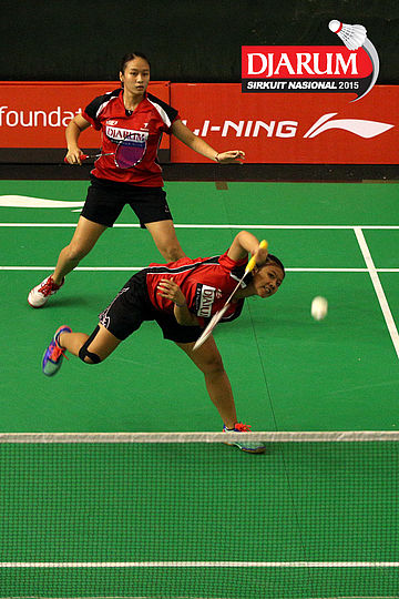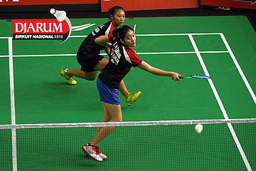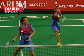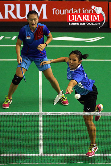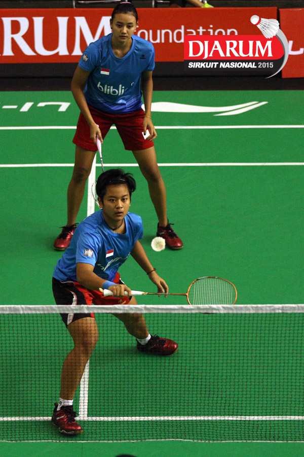Meirisa Cindy/Nisak Puji (Pelatnas) bersiap menyambut pengembalian dari Inten Ratnasari/Uzchi (SGS PLN/Guna Dharma).