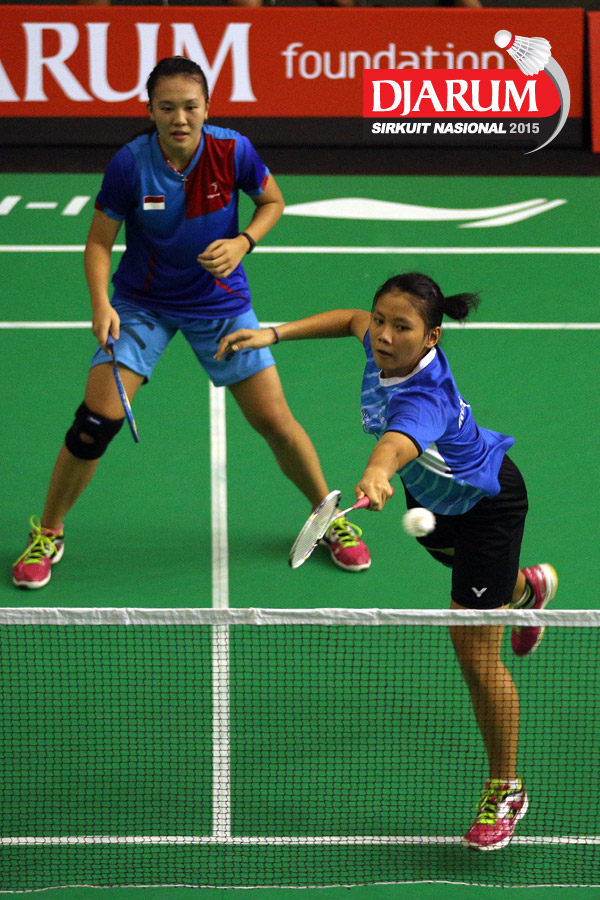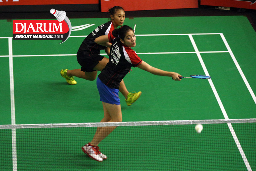 Felicia Parmenas/Tutut Novi (Djarum Kudus) mengembalikan shuttlecock ke arah Aliana Kurniawati/Istrati Putri (Candra Wijaya/JR Enkei).