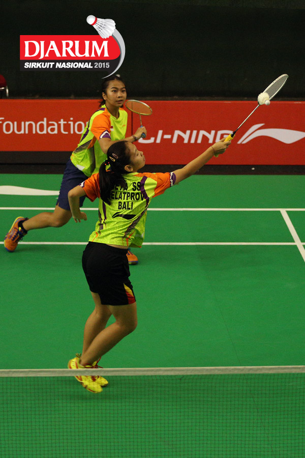 Made Deya Surya Saraswati/Ni Made Pranita (Pelatprov Bali) mengembalikan shuttlecock ke araj Syifa Fauziah/Virny Putri (Jaya Raya).
