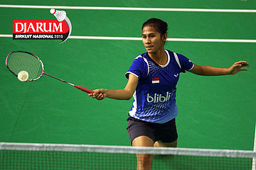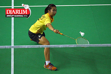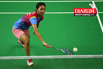 Ni Made Pranita (Pelatprov Bali) mengembalikan shuttlecock ke arah Maharani Ayu (Hi Qua Wijaya).