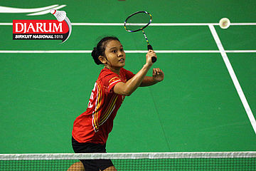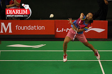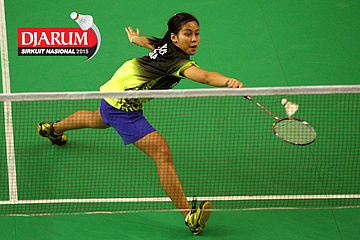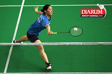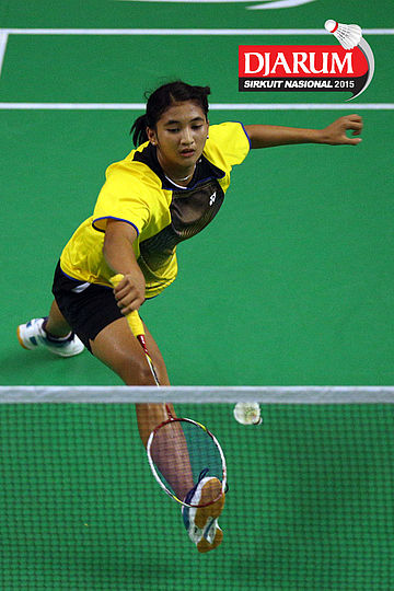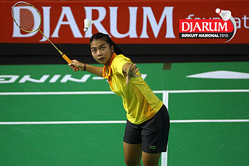 Haruka Nidaira (Tomioka Jepang) mengembalikan shuttlecock ke arah Isra Faradilla (Exist).