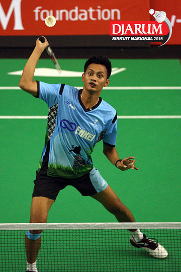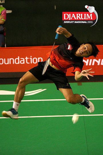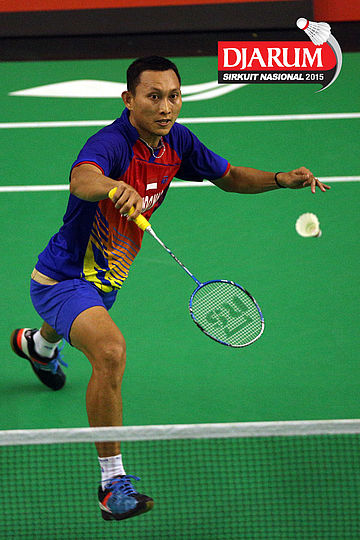 Sonny Dwi Kuncoro (Tjakrindo Masters) bersiap menyambut pengembalian dari Alvindo Saputra (Tangkas).