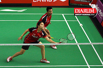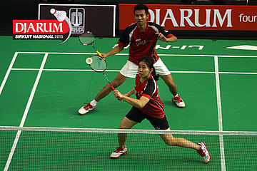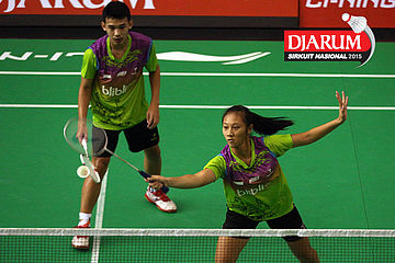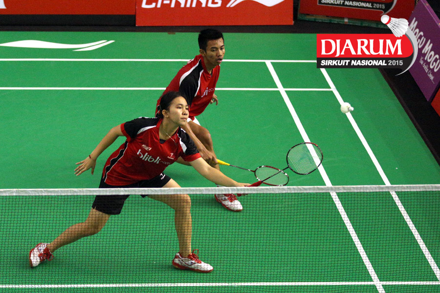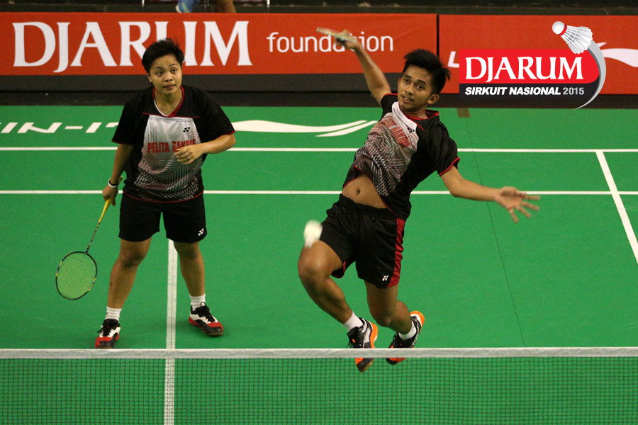 Fauzi Habibie/Apriani Rahayu (Pelita Bakrie) mengembalikan shuttlecock ke arah M. Agung/Anita (Hi Qua Wima/Citra Raya Unesa).