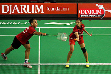 Andika Ramadiansyah/Mychelle Crhystine (Djarum Kudus) bersiap menyambut pengembalian dari Jericho See/Syahara Putri (SKO Ragunan).