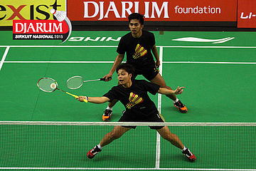 Andrei Adistia/Vita Marissa (Djarum Kudus) bersiap menyambut pengembalian tanggung dari Ardiansyah Putra/Devi Tika Permatasari (Berkat Abadi).