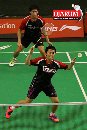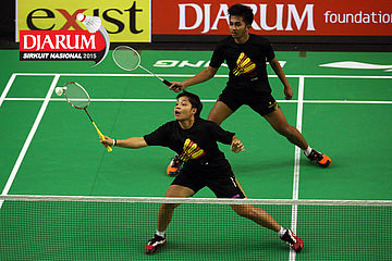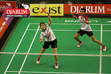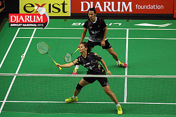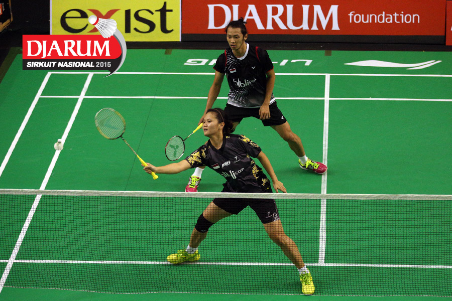 Akbar Bintang/Ristya Ayu (Djarum Kudus) menyambar pengembalian dari Fran Kurniawan/Komala Dewi (Djarum Kudus).