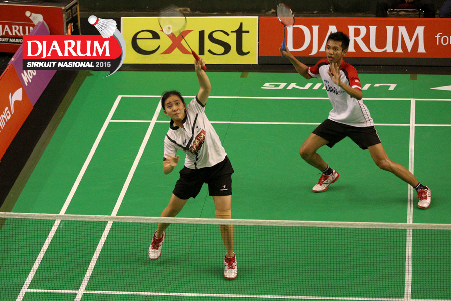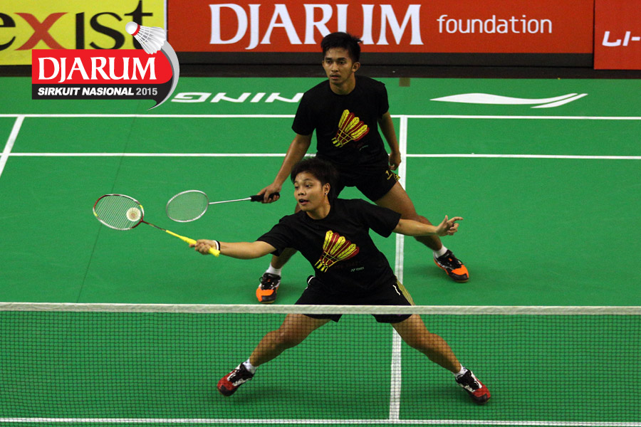 Fran Kurniawan/Komala Dewi (Djarum Kudus) mengembalikan shuttlecock ke arah Akbar Bintang/Ristya Ayu (Djarum Kudus).