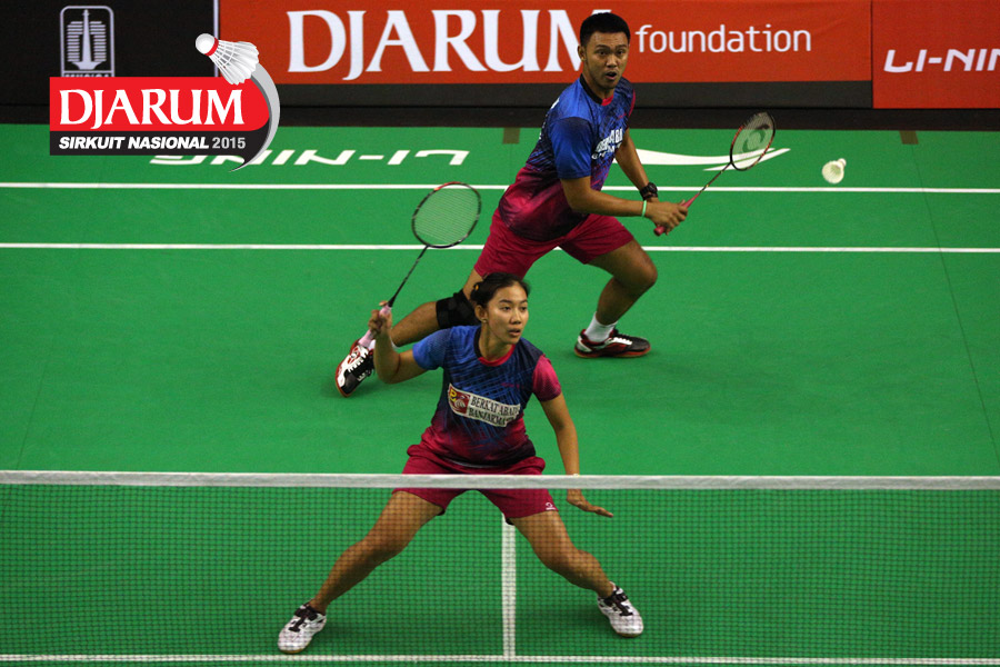 Fran Kurniawan/Komala Dewi (Djarum Kudus) bersiap menyambar pengembalian tanggung dari Akbar Bintang/Ristya Ayu (Djarum Kudus).