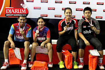Fran Kurniawan/Komala Dewi (Djarum Kudus) menyambut pengembalian dari Andrei Adistia/Vita Marissa (Djarum Kudus).