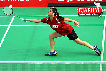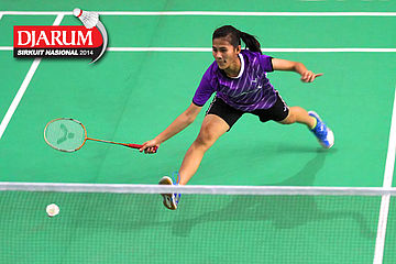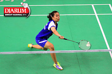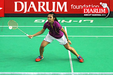 Marsa Indah (PB Djarum) berusaha mengembalikan shuttlecock ke arah Aditi Anand (India)