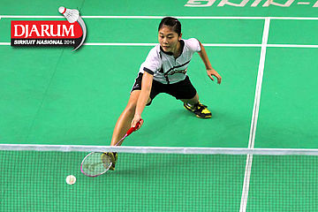 Rafika Mutiara (Candra Wijaya) berusaha mengembalikan shuttlecock ke arah Fitria Anggraeni (Exist)