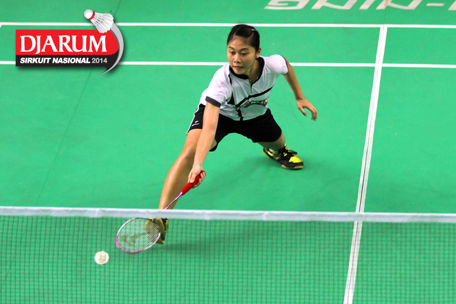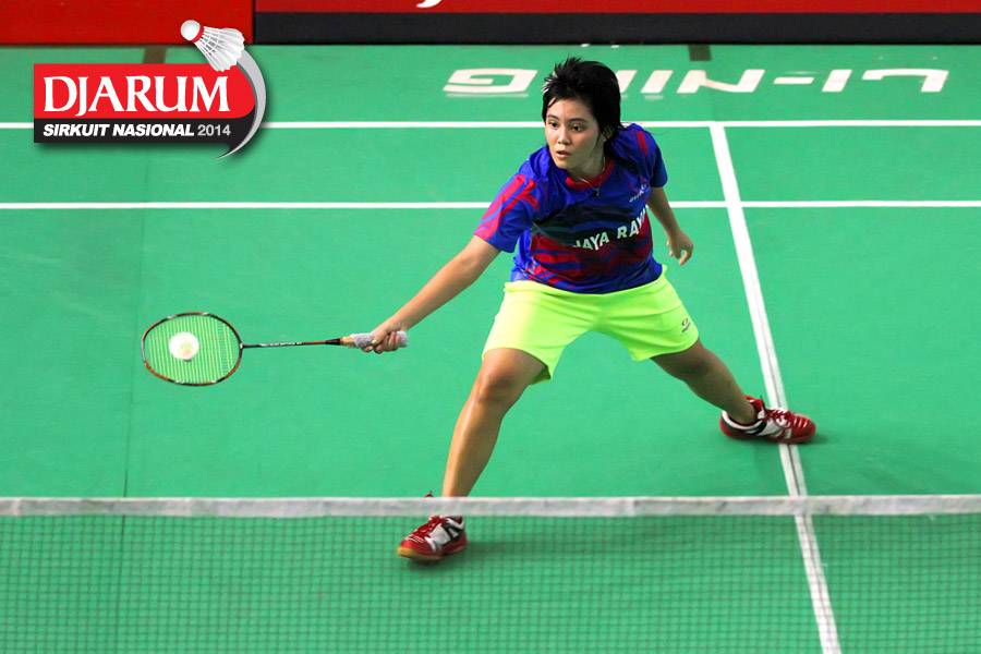 Lya Ersalita (Jaya Raya) mengembalikan shuttlecock ke arah Mira Meilani (SGS LN)