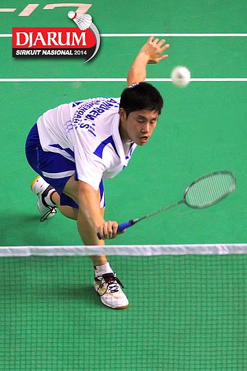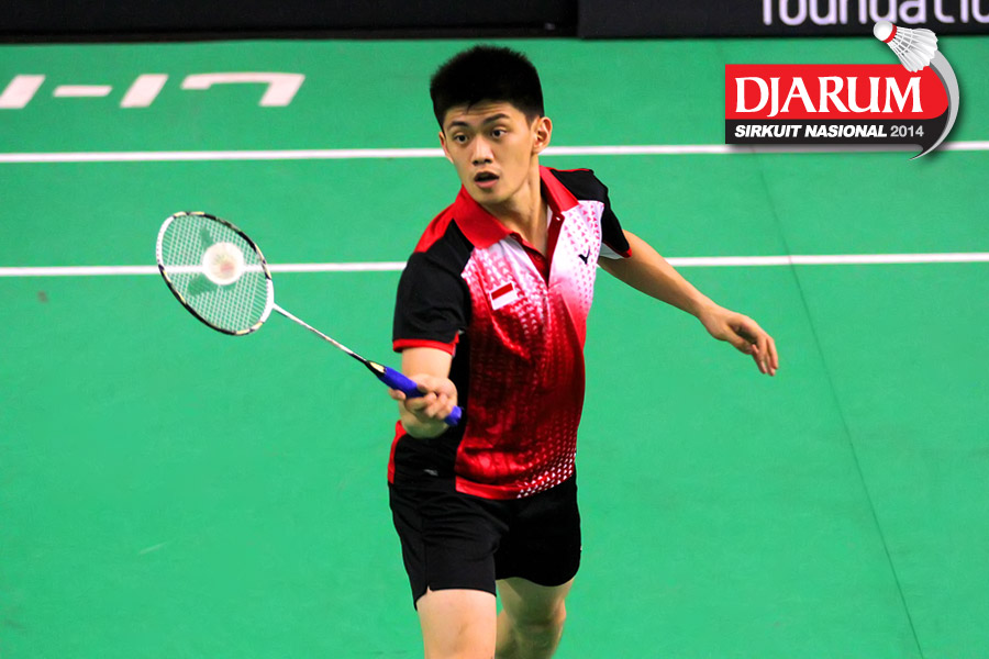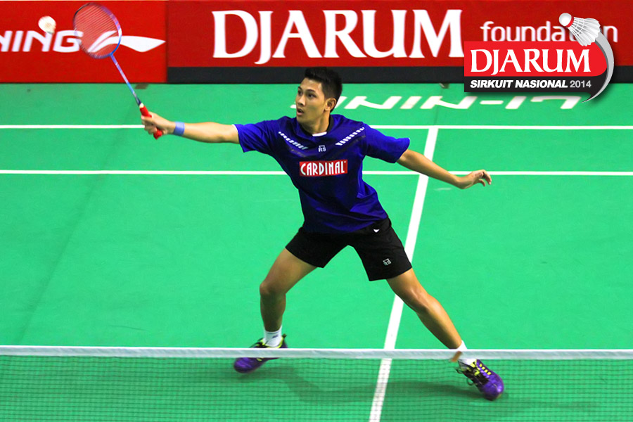 Kho Henrikho (PB Djarum) mengembalikan shuttlecock ke arah Naohiro Matsukawa (Hitachi Jepang)