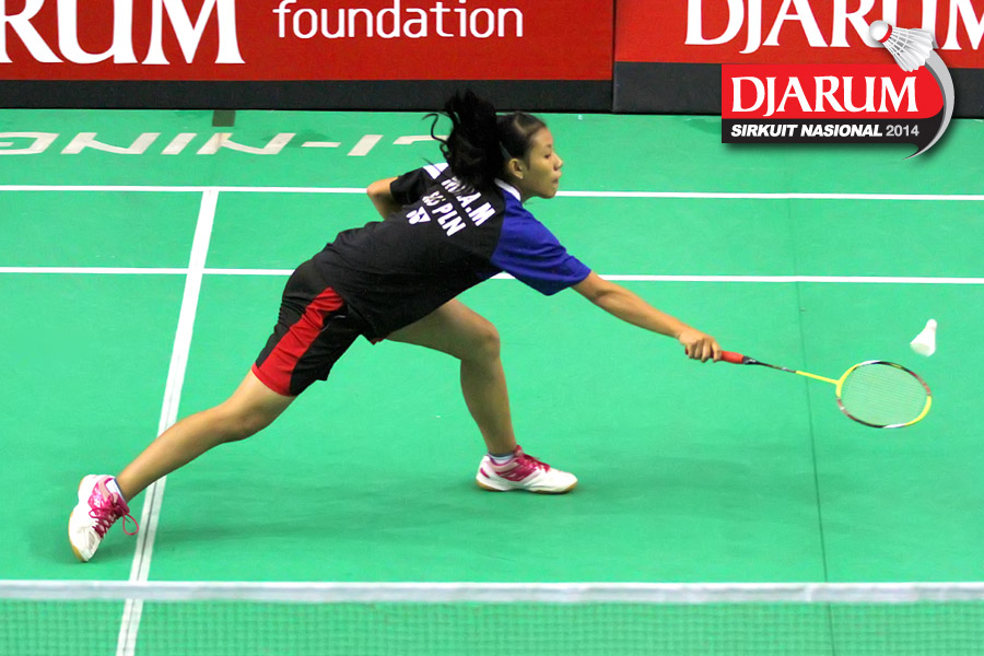 Mira Meilani (SGS PLN) berhasil menghadang serangan yang dilepaskan Devi Yunita (PB Djarum)