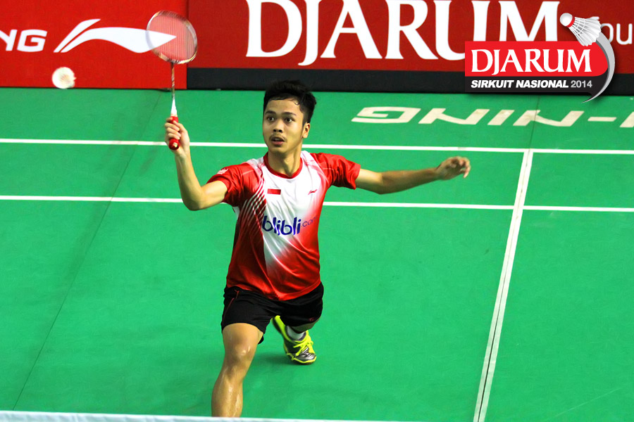 Anthony Sinisuka (Pelatnas) bersiap menyambar pengembalian tanggung dari Indra Setiawan (Pertamina Indonesia)