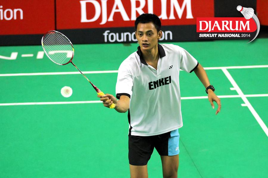 Andrew Susanto (Sarwendah) mengembalikan shuttlecock ke arah M. Fahmi (Tangkas)