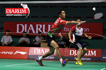 Bagas Kristianto (Djarum Kudus) bersiap menyambar pengembalian.
