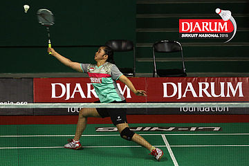 Ana Rovita (Pertamina Fastron) bersiap mengembalikan shuttlecock.