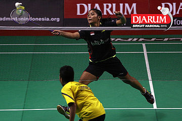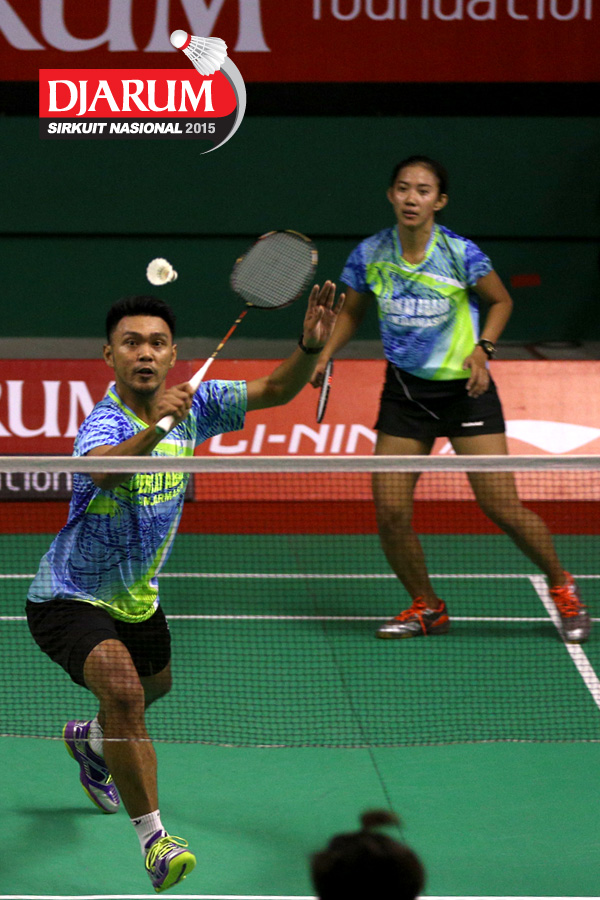 Ardiansyah Putra/Devi Tika (Berkat Abadi) bersiap menyambar pengembalian.