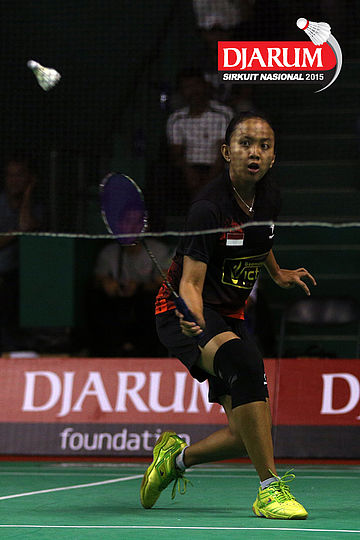 Renna Suwarno (Victory Bogor) mengembalikan shuttlecock.
