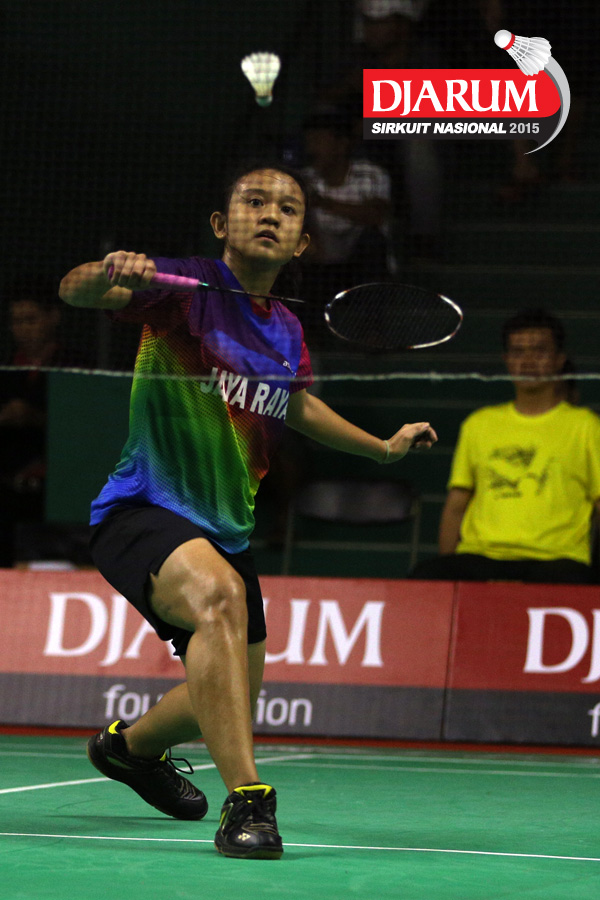 Aurum Oktavia (Jaya Raya) menyambut shuttlecock.