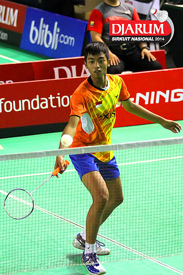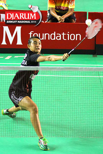 Andi Fadel (Jaya Raya) bersiap menyambar pengembalian tanggung dari Calvin Ryan Mamoto (PB Djarum)