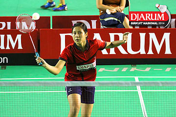 Agdevika Rochmadhani (PB Djarum) bersiap menyambar pengembalian dari Virny Putri (Jaya Raya)