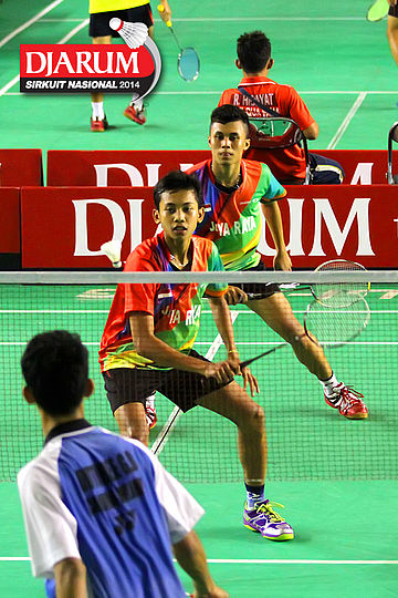 Danang Dwi/R. Eka Fajar (Jaya Raya) bersiap menyambut pengembalian dari Duthtee Gigih/Widu (Candra Wijaya)