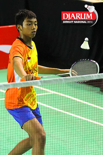 Calvin Ryan Mamoto (PB Djarum) bersiap menyambut pengembalian dari Andi Fadel (Jaya Raya)
