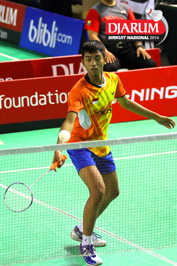 Calvin Ryan Mamoto (PB Djarum) berhasil menghadang serangan yang dilepaskan Andi Fadel (Jaya Raya)