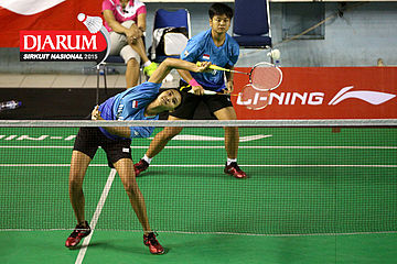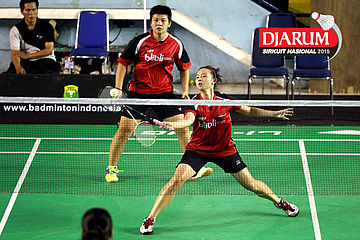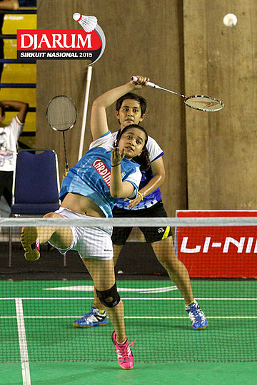 Desyeni/Firas Hasna (Guna Dharma) mengembalikan shuttlecock ke arah Deariska Putri/Nurbeta Kwanrico (Djarum Kudus).
