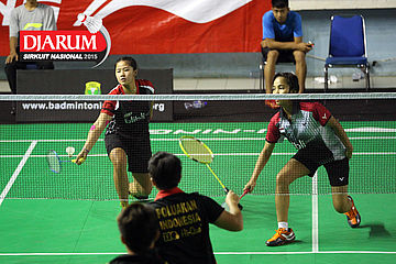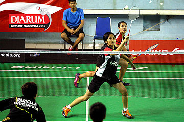 Meirisa Cindy/Nisak Puji (Pelatnas) mengembalikan shuttlecock ke arah Inten Ratnasari/Uzchi Ananda (SGS PLN/Guna Dharma).