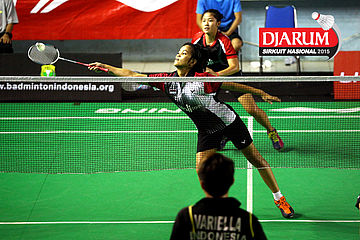 Febriani Endar/Jesicca Shohan (Djarum Kudus) menyambut pengembalian dari Nathalia Poluakan/Variella Aprilsasi (JR Enkei/Tjakrindo Masters).