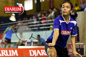 Linda Mutiara (Mutiara Cardinal) mengembalikan shuttlecock ke arah Rafika Mutiara (Candra Wijaya).