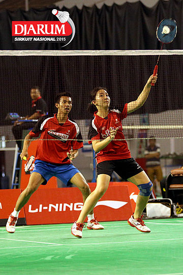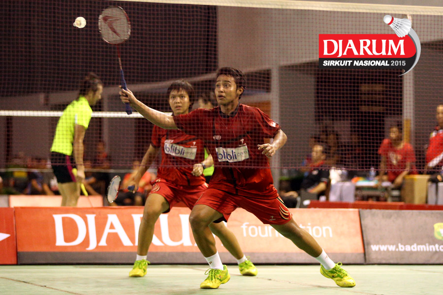Fran Kurniawan/Komala Dewi (Djarum Kudus) menyambut pengembalian dari Irfan Fadilah/Pia Zebadiah (Jaya Raya).