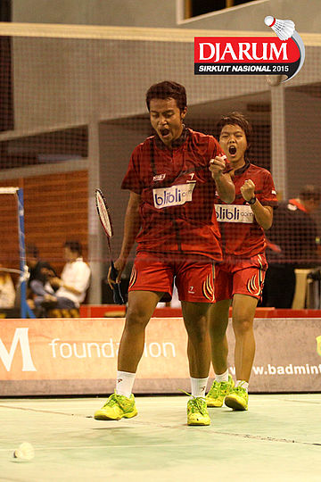 Selebrasi Rehan Naufal/Siti Fadia (Djarum Kudus) saat berhasil mengalahkan Ardy Nugroho/Vanadia Pranasa (Djarum Kudus).