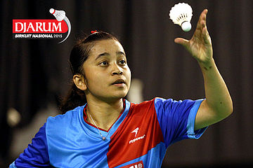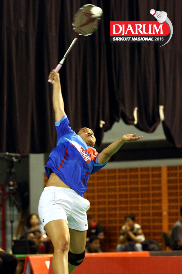 Aprilia Yuswandari (Semen Gresik) mengembalikan shuttlecock ke arah Hera Desiana (Mutiara Cardinal).