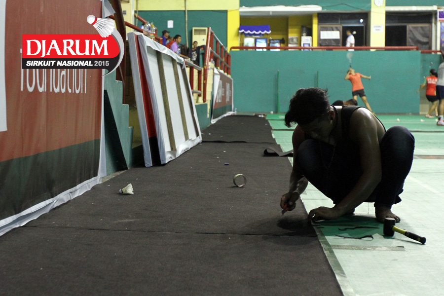 Salah satu pekerja saat memasang perlengkapan Djarum Sirkuit Nasional Li-Ning Jawa Timur Open 2015