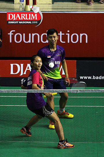 Yusril Argya/Peni Lanjarsari (Suryanaga Surabaya) mengembalikan shuttlecock