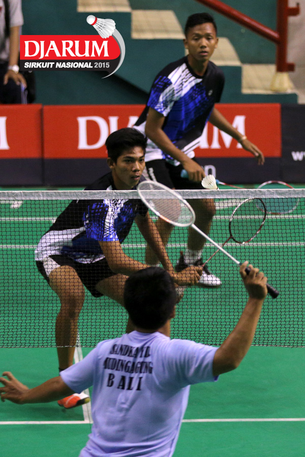 Gerald Siahaan/Yongky (Pelatprov Bali) mengembalikan shuttlecock