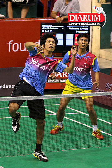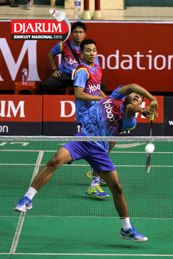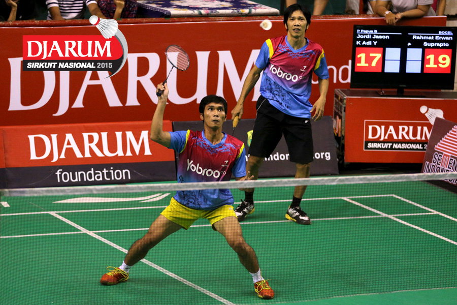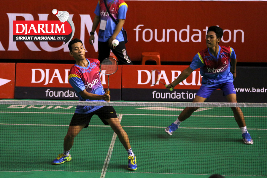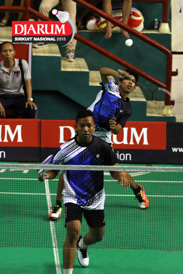 Rahmat Erwan/Suprapto (BOCEL) mengembalikan shuttlecock