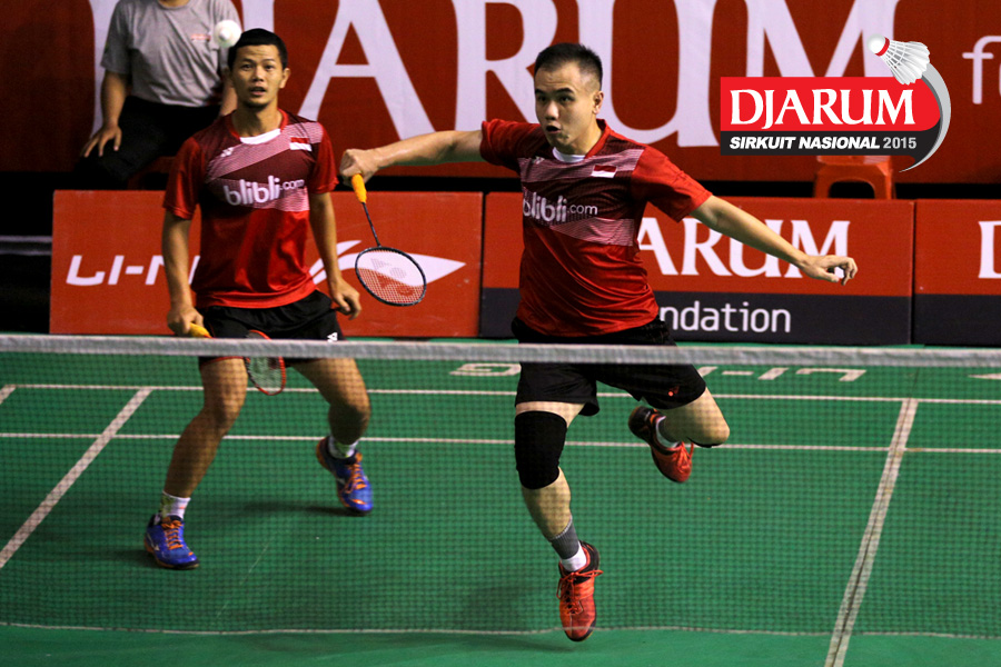 Gema Goeyardi/Heri Setiawan (Candra Wijaya) mengembalikan shuttlecock