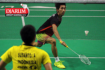 Wisnu Yuli (Djarum Kudus) mengembalikan shuttlecock