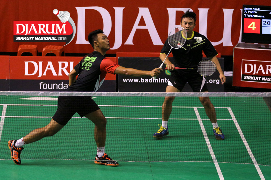 Ardiansyah Putra/Trikusuma Wardhana (Berkat Abadi/Exist) mengembalikan shuttlecock